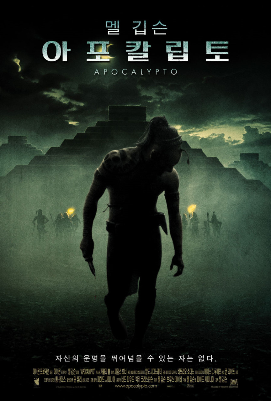 2006년 12월에 개봉한 멜 깁슨 감독의 미국 영화. 마야 문명을 바탕으로 한 추격전을 다루는 영화이다. 고품격 영상미와 후반부의 빠른 전개는 영화에 완전히 몰입하게 해 준다. 제79회 아카데미 시상식 분장상, 음향효과상, 음향편집상 후보에 올랐다. 하지만 침략을 옹호하는 식으로 해석될 수 있어 논란을 일으킨 영화이기도 하다. 아포칼립토는 그리스어로 새로운 출발, 시작을 뜻하기도 한다. 촬영지는 멕시코의 베라크루스로 잦은 비로 인해 애를 먹었다고 한다. 재규어 발이 아들과 아내를 숨겼던 깊은 구덩이는 실제로 유카탄 반도 일대에 많다고 한다.